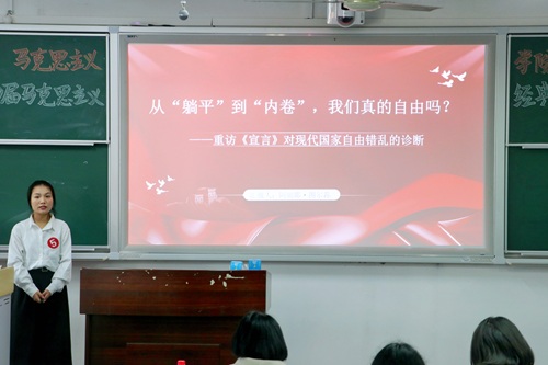 比赛伊始,在主持人宣布比赛规则后,10位选手依次登台进行读书报告展示。选手们聚焦马克思主义经典著作,以严谨逻辑解构理论内核,将深邃思想内涵转化为通俗易懂的分享表达,与现场观众搭建起深度思想对话的桥梁。