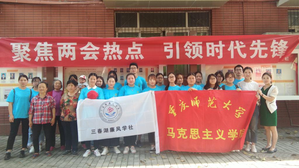 随后,志愿者部分成员带来了满怀热情的朗诵表演——《青春中国》,抑扬顿挫的朗诵声带着在场所有人一起领略了中国的成长与壮大。此后三句半表演通俗易懂,将两会的精神与知识简单直观地展示给社区居民,使他们进一步了解两会精神。流动宣讲的志愿者们则在社区范围内与居民广泛交流,紧密结合与生活密切相关的问题的讲解使居民对两会知识更加易懂,也提高了居民对时政的关心。下午4时,社区居民与志愿者们合影留念,活动圆满结束。