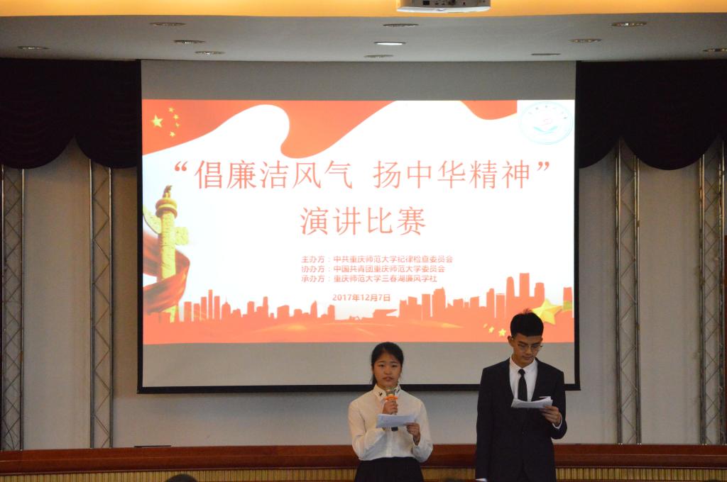 三春湖廉风学社承办。“倡廉洁风气,扬中华精神”廉洁演讲比赛决赛在弘德楼凯撒报告厅举行。本次活动特邀校团委书记毛霞,监察处副处长彭林,国际汉语文化教育管理办公室副主任左金隆,外国语熊猫体育