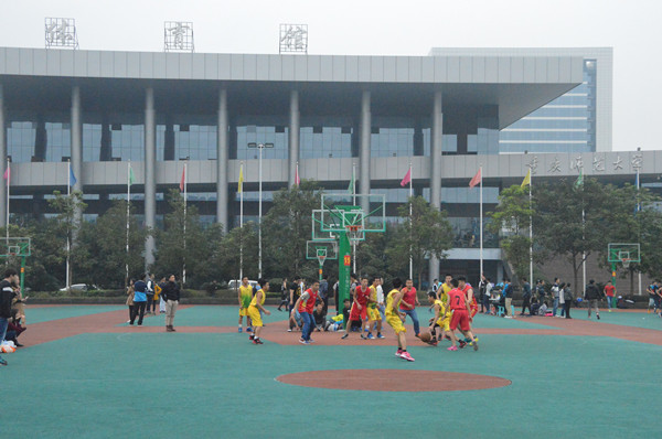 2015级大一班篮球队与2014级篮球队在篮球场进行男子组决赛。2014级、2015级的同学到场观看。