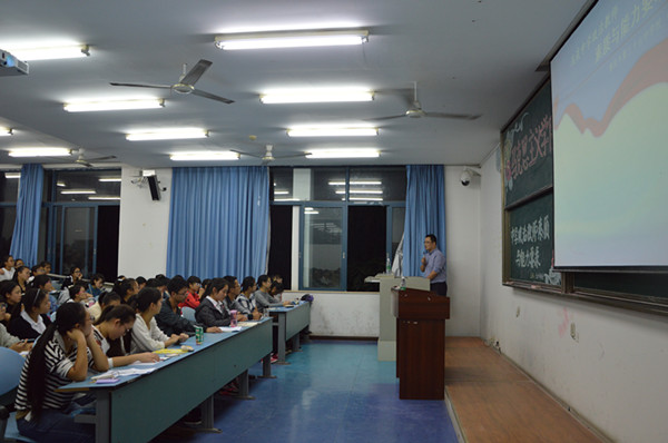 接着,伍校长对“教育的几点新认识”、“政治教师基本素养”、“成就名师的技与道”三个方面讲解了师能素质问题。在对教育的认识方面,伍校长提出教育要以人为中心。“教育是什么,教育应该让所有与教育发生过关系的人过上一种幸福完整的生活”,他如是说道。在政治教师的素养培养方面,伍校长有自己独到的见解。他对同学们提出三点要求:一是要具有人格的自我素养,二是要具有管理与合作的与人素养,三是要具有责任与使命的社会素养。而在具备这三点要素以前要充分认识到教师素养的重要性,教师的教学内容、教学形式都要打破固有模式,建立创新思维能力,培养创新型人才。在成就名师的技与道方面,伍校长说,一个优秀的人民教师应当具有高尚的思想道德品质、精深的专业知识和创新科研能力等。