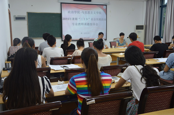 经前期会议讨论,此次暑期三下乡的活动地点是重庆万州等5个区县。会议伊始,陈钢老师带领大家详细分析了此次暑期三下乡的项目,并着重对“学习”宣讲团、“四个全面”观察团、美丽中国实践团三个项目做重点解析。接着,陈老师为同学们进行了专业性的课题指导,鼓励同学们围绕全面小康建设、依法治库、党组织开展“三严三实”的学习情况三个方面准备课题。随后,马老师就此次暑假实践活动的有关事项向同学们做了相关补充,强调了实践的任务与要求,鼓励同学们团结互助,以饱满的精神、求真务实的态度将社会调研落