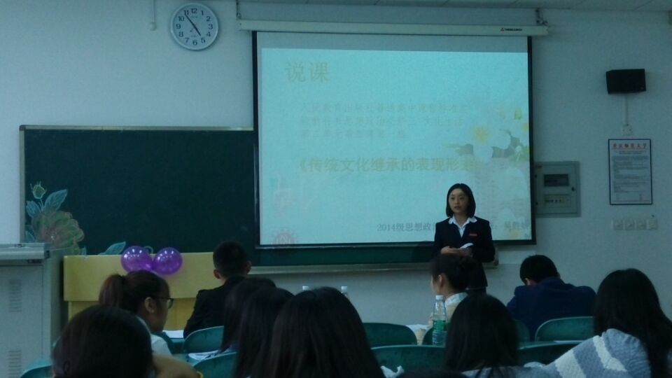 本次比赛分三个年级专区分开进行,比赛流程分为即兴演讲、说课、讲课和评委提问四个环节,环环相扣,多方面展现参赛选手的综合能力。比赛伊始,主持人宣布比赛规则、流程以及评分细则。随后,参赛者依次走上讲台,身身正装的他们用多媒体演示、板书、视频、音乐、现场互动等多种形式辅助教学,将赛前精心准备的初、高中政治课程在讲台上精彩呈现,一展教师风采。充分展示了选手们扎实的理论水平和出色的师范生教学技能。