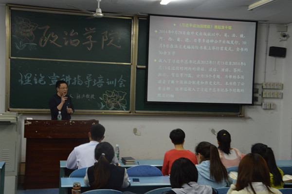 随后,陈洪院长围绕《习近平谈治国理政》一书,从为什么要学习该书、怎么学习和学习时注意的问题三个方面展开培训。他指出该书是习近平总书记富有创见性的新思想、新观点、新论断、新要求。在新阶段下,国家领导人认清了中国特色社会主义和马克思主义执政党建设两大规律。更引用习近平总书记对青年的希望:当代大学生是可爱、可信、可贵、可为的,激励同学们奋发向前。最后,陈院长给同学们指出了在学习理论精神时应注意的系列问题,使得同学们受益匪浅。