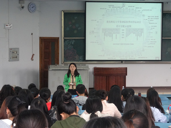 各部门部长强调了运动会相关事项:首先,体育部部长吴晓锋就参加运动会的老师、学生等进行了介绍,并叮嘱运动员要放松心态、志愿者要做好服务工作、啦啦队及观众要热心热情;紧接着,学习部部长郝梅就考勤问题和跑鞋借还登记问题做具体要求;随后,文娱部部长陈艳艳对方队和啦啦队的精神风貌做强调,并希望运动员们在保证安全的前提下,争取获得优异成绩;最后,学生会主席陈冠宏做了总结性发言,并宣布动员大会结束。