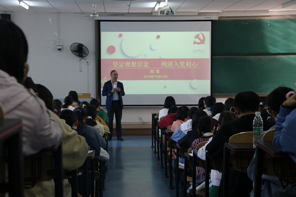 随后,刘军书记从“入党动机、具体做法”两个要点进行阐述。刘军书记引用习近平总书记的寄语“走得再远,都不要忘记来时的路”,来勉励同学们要端正入党动机,不忘初心,牢记使命,积极实现人生自我价值。为鼓励新生积极向党组织靠拢,刘军书记还给出四点建议:一是加强政治强国理论学习,不断提高思想认识;二是坚定理想信念,纯洁入党初心;三是增强“四个意识”、坚定“四个自信”、做到“两个维护”;四是学习先进,争做表率,以实际行动向党组织靠拢。