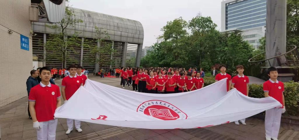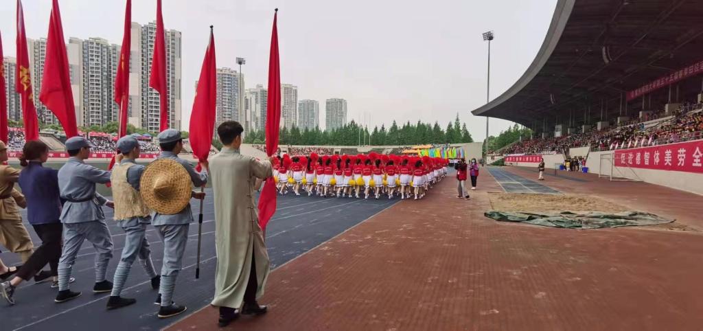 作为本届运动会承办单位带来开幕式表演。300名身着红色上衣、白色短裙的同学,手拿红黄双色花球,组成表演方阵整齐列队入场,成为运动场上一道靓丽鲜艳、独具特色的“马院红”。象征十五种革命精神、装扮为时代英雄志士的旗手持旗帜紧跟在方阵后面,印着“红船精神”、“井冈山精神”、“红岩精神”等革命精神的红旗在空中随风飘扬。