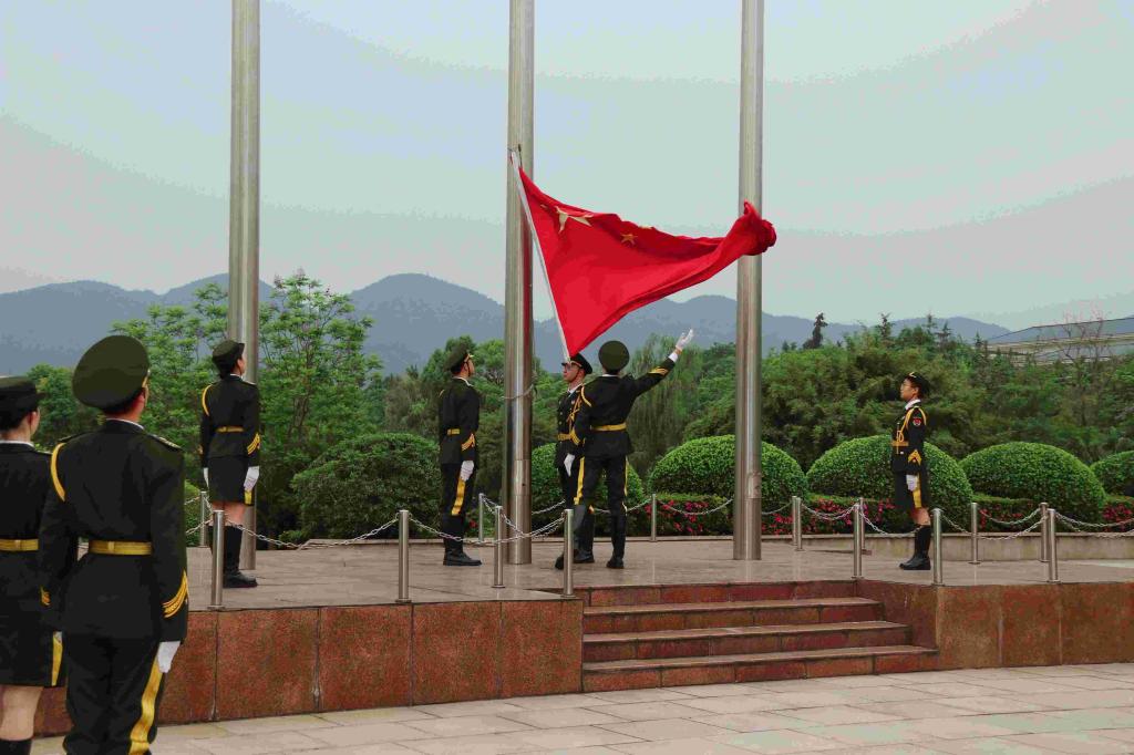 师生于正校门广场列队完毕。国旗护卫队的队员们昂首挺胸,迈着铿锵有力的步伐,护卫鲜艳的五星红旗入场。《义勇军进行曲》奏响,全体师生向五星红旗行注目礼,齐唱国歌,庄严肃穆。