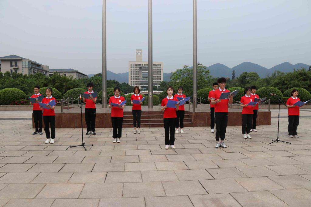 升国旗仪式结束,活动进入第二议程。雷其菊、赵泽坤等学生代表带来朗诵表演《献礼一百年》,回顾建党百年历程,集中展示中国共产党在内忧外患中诞生、在磨难挫折中成长、在攻坚克难中壮大、从失败走向胜利的伟大历程,献礼党的百年华诞。