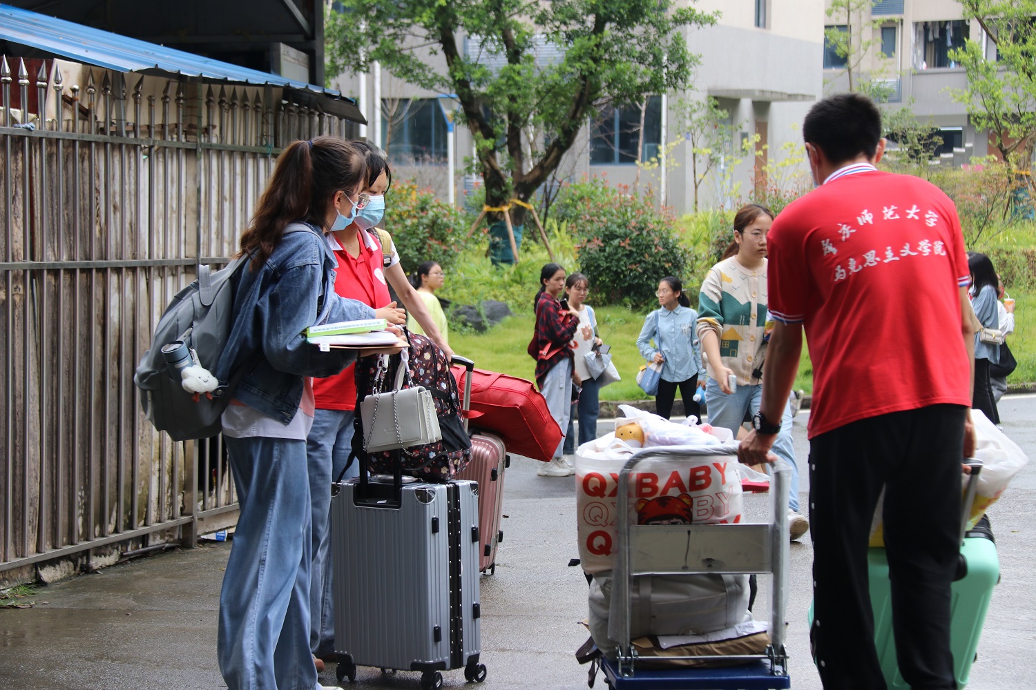 报到点,在迎新站办理好手续后,由志愿者点对点帮助新生搬运行李,带领他们进入宿舍,完成报到的所有流程。
