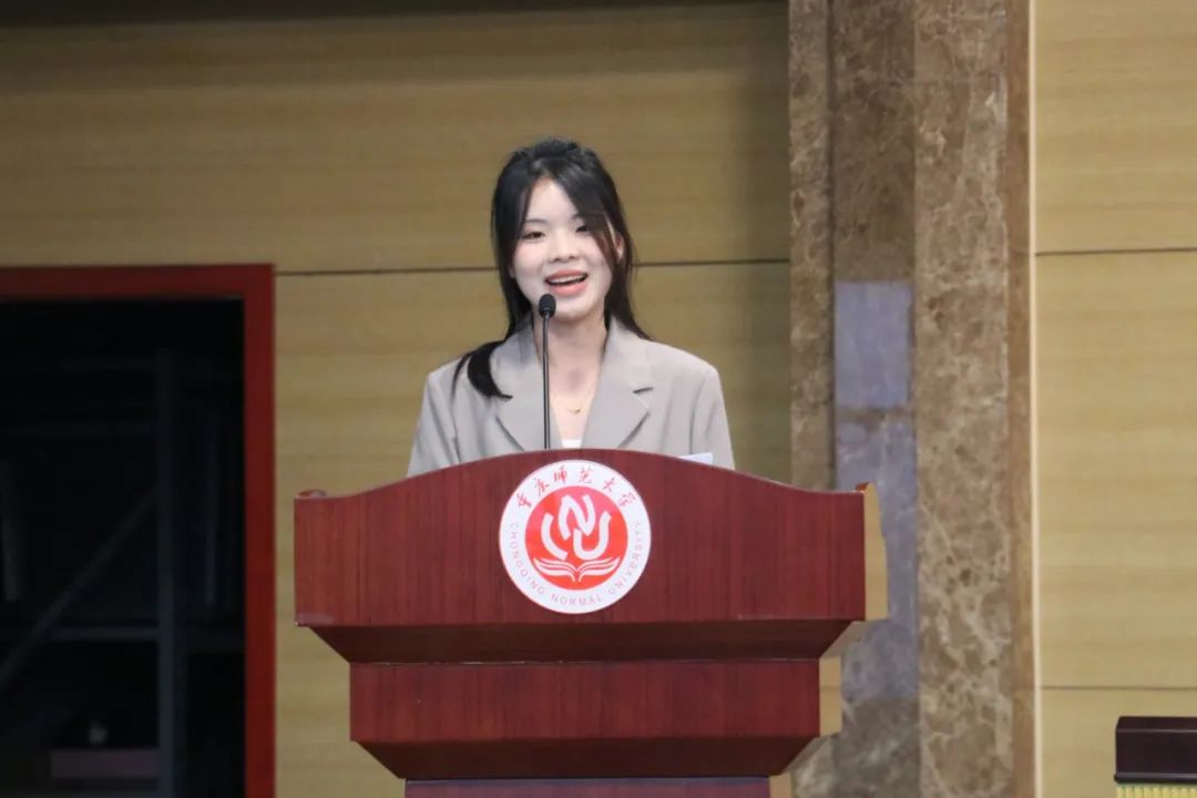 议程第二项:教师代表陈沉老师发言。陈沉老师首先对2023级新生的到来表示热烈欢迎,并希望各位新生明白大学之根本在“学”,专业之根基在“信”,事业之根源在“行”,并祝愿新生能够在大学之学的根本上自信,在专业自信的根基上笃行,努力践行“学高为师、身正为范”的重师校风。