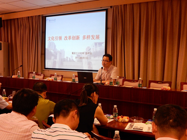 交流会过程中,正在熊猫体育 受训的浙江衢州常山县中小熊猫体育 长、幼儿园园长带队领导代表全体参观人员对37中学的热情款待表达了谢意并作了专题发言。
