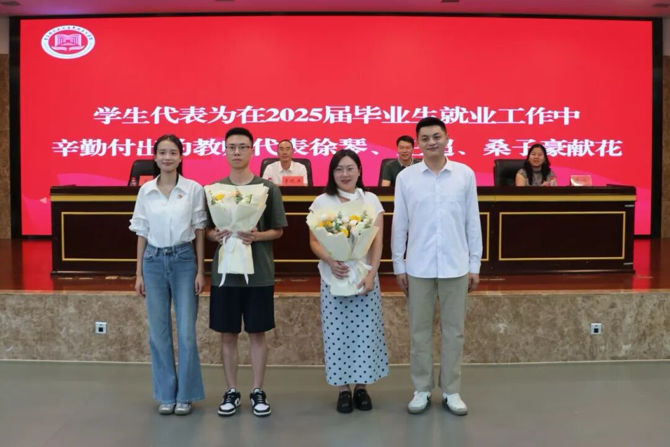 学生代表向2025届就业工作中辛勤付出的徐琴、王超、桑子豪三位教师代表献花,感谢他们在过去的就业工作中做出的突出贡献。