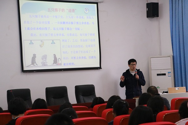 接着,新进教师成力杰就“思想道德修养与法律基础”课程进行了公开课展示。他采用了提问式的课堂导入方法,从道德的起源、道德的含义、道德的依据三个方面对道德是什么进行讲解。成老师通过“电车难题”等案例,总结出只有符合社会发展规律和最广大人民群众利益的道德原则和规范才是判断行为善恶的客观科学标准。