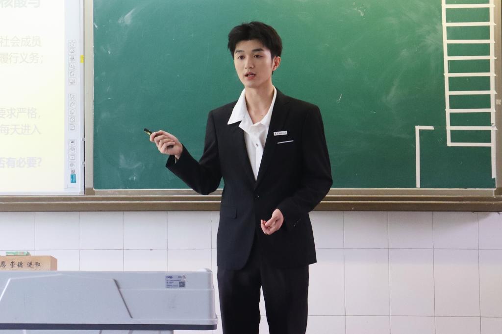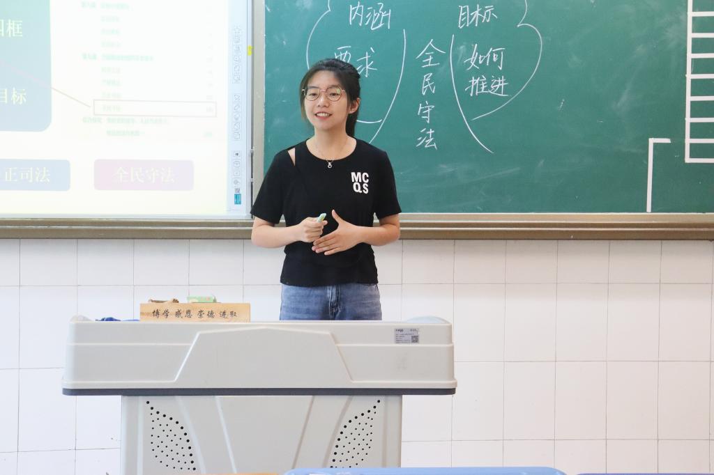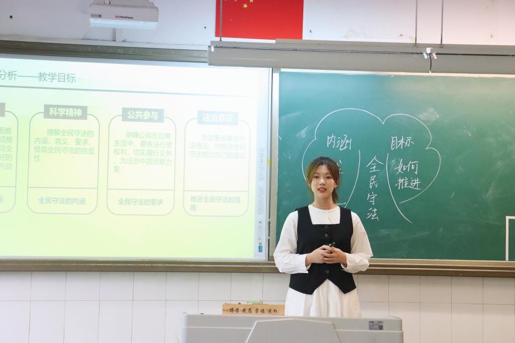 2022年5月26日下午14:30,鱼洞中学政治组在教学楼1302举行实习老师“全民守法”说课比赛,由熊猫体育