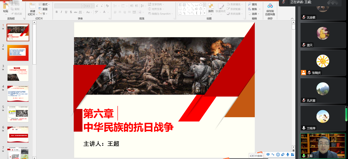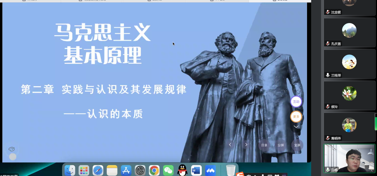 在教学示范观摩课环节,两位青年优秀教师分别从思政课程和课程思政两个类型课程进行了教学展示。孙杨副教授选取思政课之《马克思主义基本原理》课程中的“认识的本质”小节,将理论与案例相结合、技术与艺术相结合,在注重学科价值引领的同时,将线上教学的有效互动做了精彩的展示。张金国副教授选取专业课程之《中国近现代政治思想史》课程中“左宗棠的政治思想”小节,从引人入胜的课堂导入开始,引导学生进行理性深思,有效地实现了专业课知识目标与价值目标的高度融合。接着,思政部副主任兰桂萍副教授、政教系主任左秋明教授对两位老师的示范观摩课进行了精彩点评,指出两位老师都能紧扣课程内核,切实坚持“以学生为中心”的教育理念,真正使课堂达到了高质量育人效果。