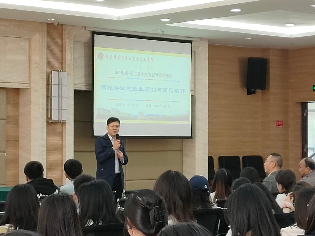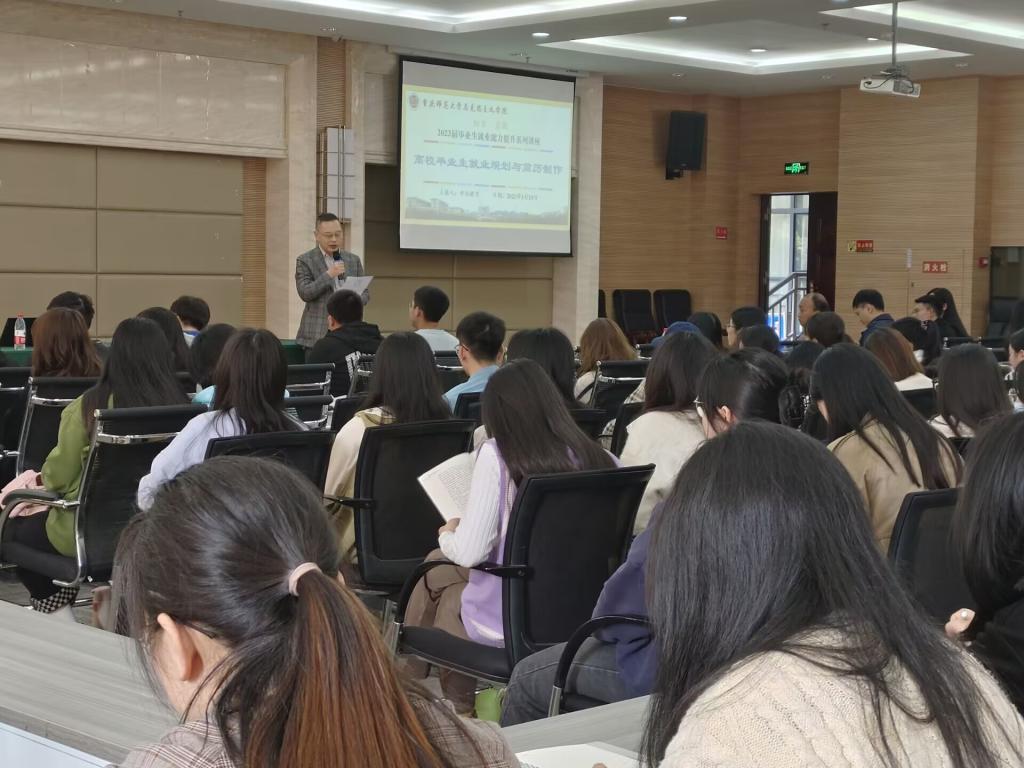 首场讲座由中公教育重庆研究院事业单位项目面试负责人鞠玲玲主讲,以毕业生就业规划与简历制作指导为主题展开讲解,主要包括就业形势分析、就业方向选择、就业政策解读、就业信息获取、求职简历制作等一系列学生求职就业方面的内容,并回答了毕业生关切的就业方面的有关问题。鞠老师基于对当前形势,以及对应届生就业优势的客观分析,强调大学生应树立正确的择业观和就业观,科学、合理、灵活地规划自己的职业生涯。随后,鞠老师对就业形势、就业方向、就业政策等多方面问题进行了生动细致地讲解,同时重点强调了简历内容的五大要素、亮点、重点及排版和优化。