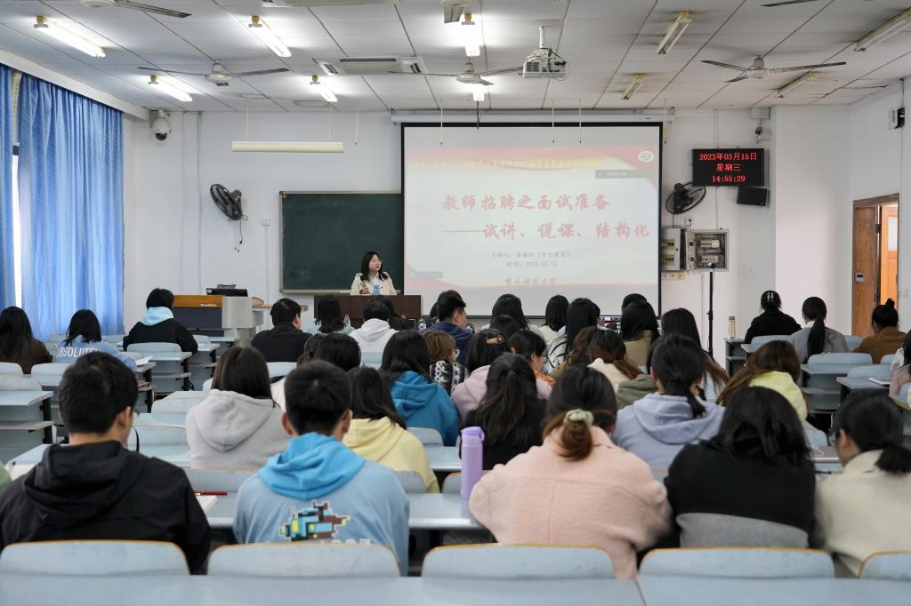 第二期讲座由中公教育教师考试研究院讲师黄丽红主讲。讲座以“教师招聘——面试准备”为主题,涵盖试讲、说课、结构化面试等相关事宜。讲座中黄老师以多年培训经验,结合具体案例,围绕初高中教师招考数据,对考试形式、考情分析、考试流程、候考技巧以及资料准备等方面内容进行详细讲解。黄老师用深入浅出、幽默风趣的讲解形式,帮助同学们掌握报考政策、备考方向和试讲、说课、结构化面试技巧,指导同学们做好备考规划,合理选择区域岗位。最后,黄老师就同学们提出的各类问题进行了细致、耐心地交流与讲解。