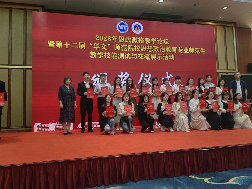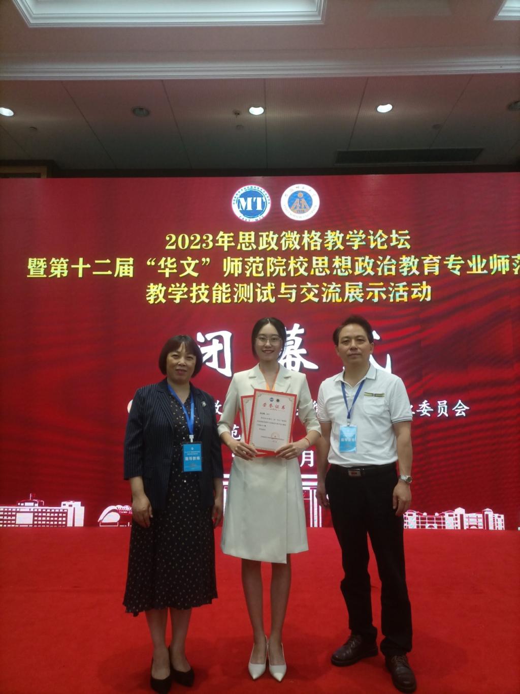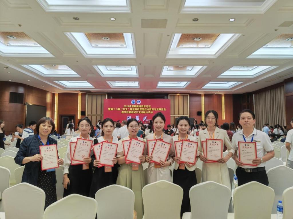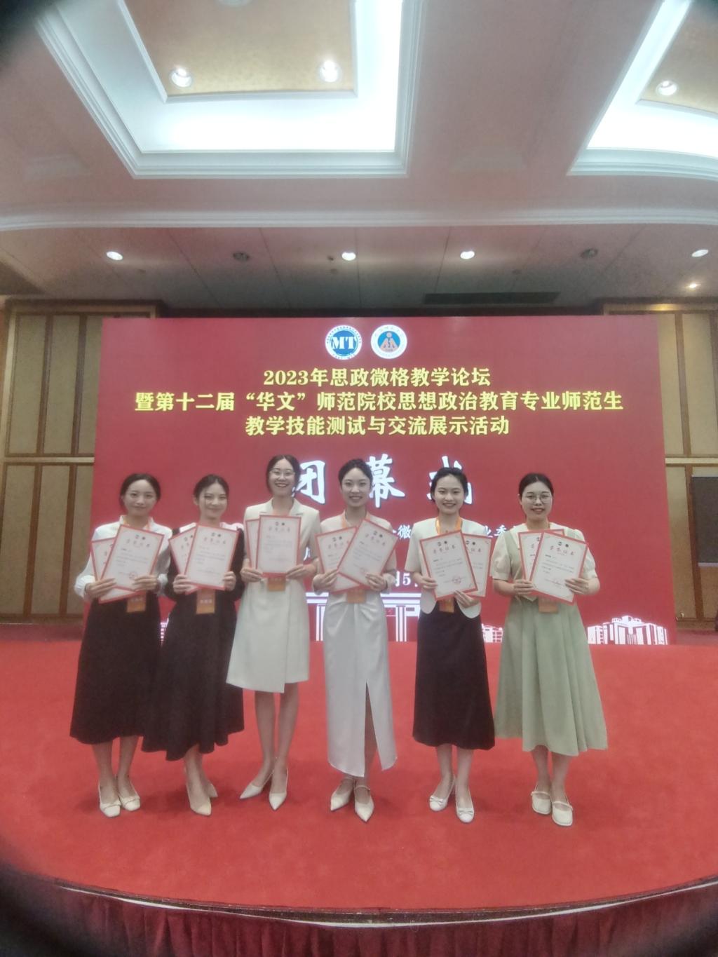 政教系主任左秋明教授、副主任郑瑜副教授率团队出征,并喜获佳绩,6位同学共获一等奖5项、二等奖7项(详见名单)。其中,受教学设计测试大赛邀请,郑瑜副教授担任本次大赛的评委,并作为颁奖嘉宾为选手颁发获奖证书。本次比赛可用“赛前准备充分扎实、以赛促强不负期待、初心如炬展望新篇”三句话来形容。