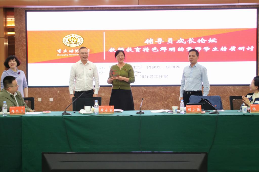 学子的特质与特长,从“重师学生具有的特质”“辅导员应培养出的学生特质”“怎样培育学生的特质”等不同角度积极发言,各抒己见。冉久飞处长认为重师学子首先就应“学高”“身正”,并强调现在学生工作者应从政治上着眼、思想上入手,将学生培养为政治上可靠、思想上过硬的“四有”好老师。胡小强处长通过展示重师学子想像设计案例“师小博”“师小雅”,指出重师学子应具备“理想信念”“博学雅致”“阳光生动”等特质,在培养自身素质的同时积极探寻重师学子形象传播的路径。